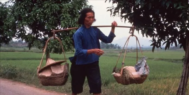 这一张特别有生活气。一个中年妇女挑着担子,从树下走过,后面是一大片田野。担子两头的竹篮不一样重,走起来肩膀得自己找平衡,这种动作,现在很多年轻人可能都没真见过。她穿的是深蓝上衣、黑裤子,头发简单往后梳,没有多余装饰。你别看只是一个赶路的瞬间,农村日子的分量,就在这一根扁担上。
