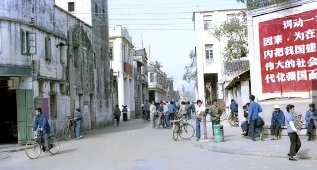 这一张是典型的老街口。路不宽,房子也不高,自行车倒是随处可见。右边墙上那块大红标语特别醒目,一下就把年代感顶出来了。可比起标语,我更注意街上那些站着、骑着、靠着的人。有人像是在聊天,有人刚停下车,还有人站在街角发呆。那时候的城市节奏明显慢,街上人不少,但不慌。生活像是往前走着,却没那么急。