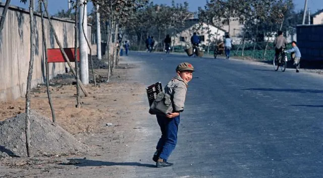 如果说前面那张小男孩是可爱,这张背书包的小学生,就是活生生的“机灵”。他一边走一边回头,笑得特别亮,书包往身后一甩,整个人像是刚从学校出来,心已经飞到路边去了。路面开阔,行人不密,远处还有骑车的人。别看只是一个小回头,那个年代孩子的状态一下就出来了:书包不轻,日子却轻。