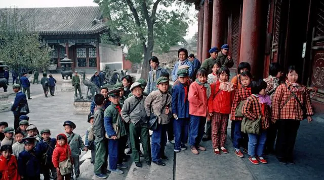 这群孩子也很有看头。有人穿灰蓝衣服,有人穿红格子上衣,站在一块儿,颜色一下丰富起来了。很多人印象里总觉得那个年代满街都是单一颜色,可照片真摆在眼前,你会发现并不是那么回事。尤其是小孩子,衣服有补丁也好,有旧痕也好,但只要收拾得整齐,照样有精神。队伍排得长长的,说明大家都守规矩,也都带着点好奇心。