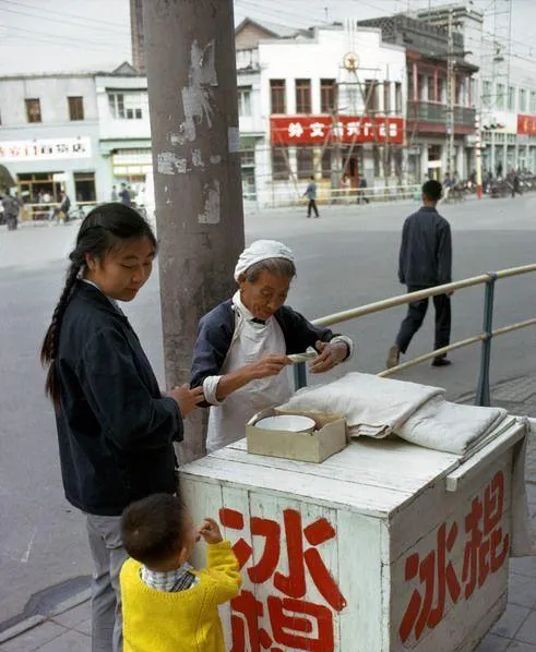 这一张,估计最能勾起不少人的嘴馋。一个简单的木箱摊子,几个字写着“冰棍冰儿”,老太太站在边上,手里正忙着拿东西,小孩伸着手,眼睛全盯在那口箱子上。小时候吃冰棍,最难忘的不是味道有多复杂,而是那种“终于买到了”的高兴。三分、五分、一毛,很多人到现在还记得清清楚楚。你小时候吃过几分钱的冰棍?