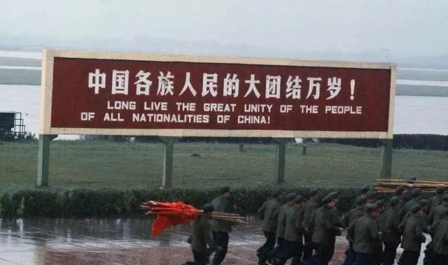 这张照片的气氛有点不一样。天阴着,地上湿着,一群人扛着东西从大标语下面走过,远远看去,画面有种很沉的力量感。可它不是电影里那种刻意做出来的“宏大”,而是很日常的集体行动。鞋上沾着泥,衣服被雨水打暗,红旗却还是鲜亮。那个年代很多记忆,就是这样混在泥土味和雨气里的。