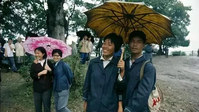 最后这一张,我觉得收得特别好。几个年轻人站在雨里,穿着蓝外套,撑着黄伞、粉伞,脸上带笑,像是等人,也像是看热闹。背景有些模糊,人的神情却很清楚。你会发现,真正让人记住一个年代的,不只是楼房、衣服、街道,更是人的精神头。