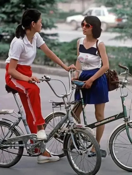 成都老照片:80年代,成都街头随拍,照片中两位少女穿着时尚,正在街头闲聊