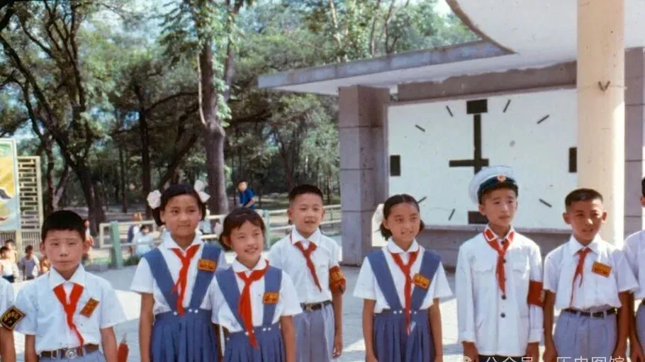 图中这群小孩胸前飘着红领巾,短袖衬衣,蓝白相间的校服裤子,手腕骨头鼓鼓的,神气十足地站成一排。后头那个大钟,时针粗得和粉笔头似的,分针笔直,老远一看校门口就知道点名啥时间了,学校里太阳辣,课间一群人挤在钟下乘凉。