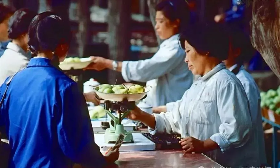 这个水果柜台,售货员一身白褂,台秤上的苹果摆得工工整整,手里压着票,眼睛盯着秤盘,收钱找票都没差。母亲说,那会工资少,买个水果得挑半天,想吃点好的要攒月头月底的零头,现在水果论箱买,那时一两一两过秤小心得很。