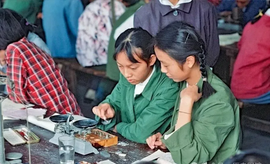 教室木桌上放着小天平,女学生认真往天平托盘里摆砝码,绿军装袖口还露了点汗渍。女生扎学生头,两根辫子垂在胸前。课堂里没有电子仪器,全靠板书粉笔和一双眼。