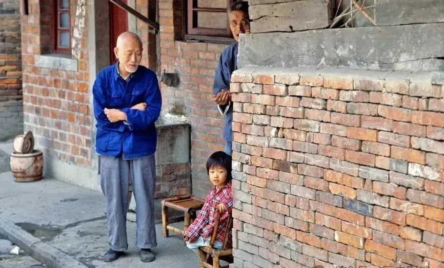 老爷爷双手抱臂,站墙根看一排院子,小孙女坐板凳上,一脸认真,门柱后还探出一张老头脸。那时候说带孩子,一人能管三四个,孩子没啥玩具,就是板凳长凳挪来挪去玩藏猫猫。