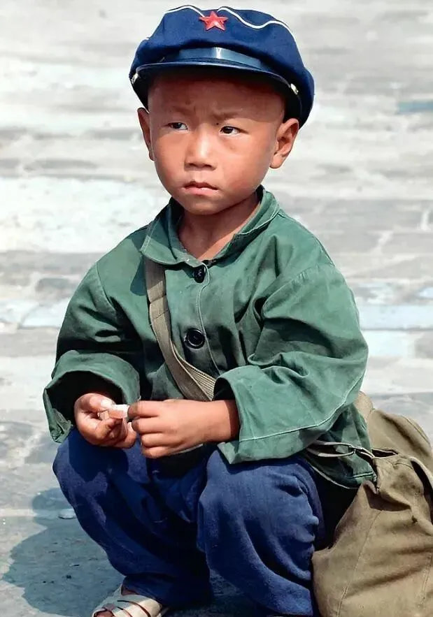 小男孩戴蓝军帽,帽徽上红五星格外显眼,身上绿军装宽宽大大,背着布包,两手捏着水果糖。奶奶说“那个小家伙,真像电影里的潘冬子,气质硬朗。”