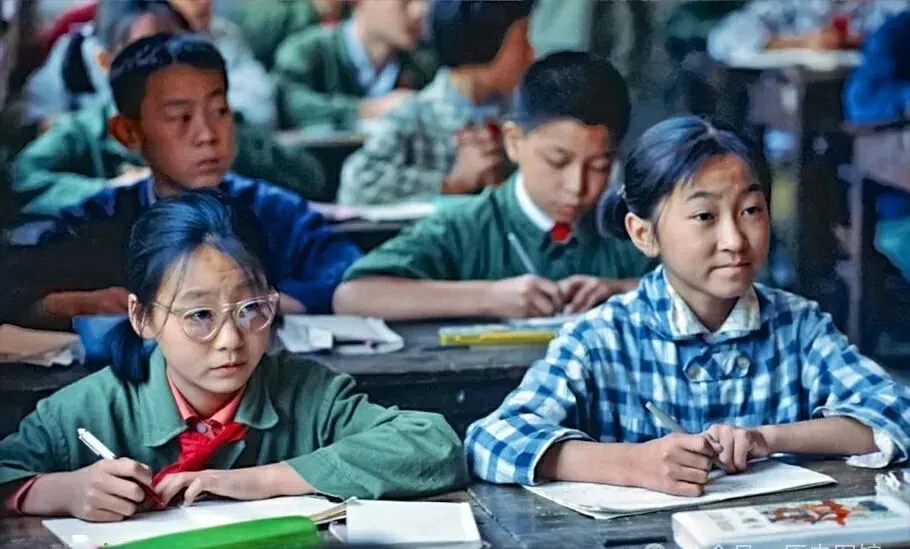 老式教室,一桌两人,头埋得低,笔在纸上沙沙响。最抢眼的是左边戴大眼镜的小姑娘,红领巾扎得很正。那时全班可能有仨四个戴眼镜的,板凳高矮不一,老师大嗓门一吼下课全班跑出去。
