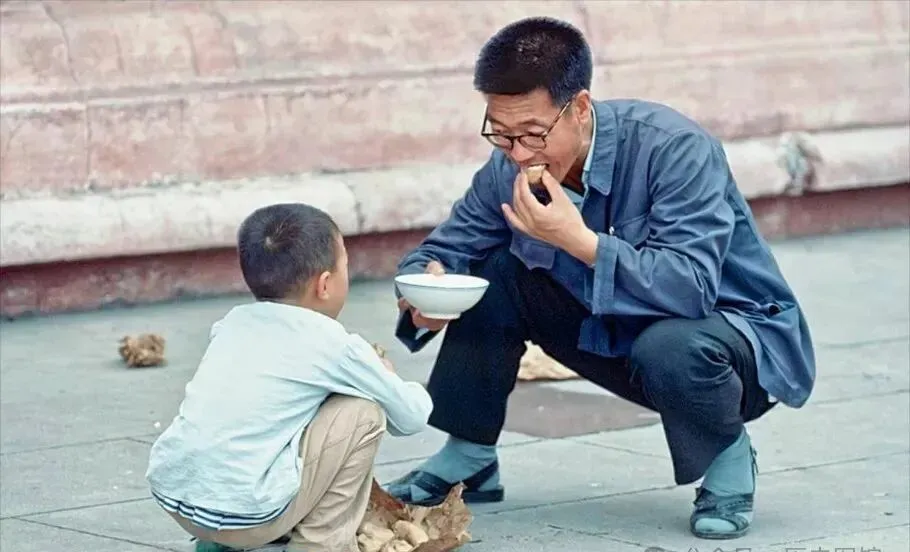 图里男人穿蓝色中山装,右手推着自行车,车筐是老竹篓,里头小孩坐着,眼睛还四处瞅。自行车那时叫**“家里第二口人”,修几回才舍得换**,娃儿不爱走路就塞筐坐稳,人多时候,家里三口能挤两台车,赶集赶镇都不怕。