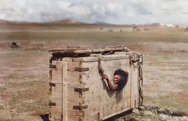 第一张就有点刺眼。空旷地上摆着个粗木箱,箱板厚重,只有头和一只手从洞里伸出来。你很难把这种画面和电视剧里的“审案场面”联系在一起,它更像一种把人当物件困住的惩罚。周围没有围观的热闹,只有风沙感,这种冷,比喊口号更让人不舒服。