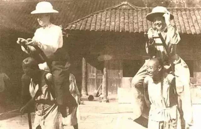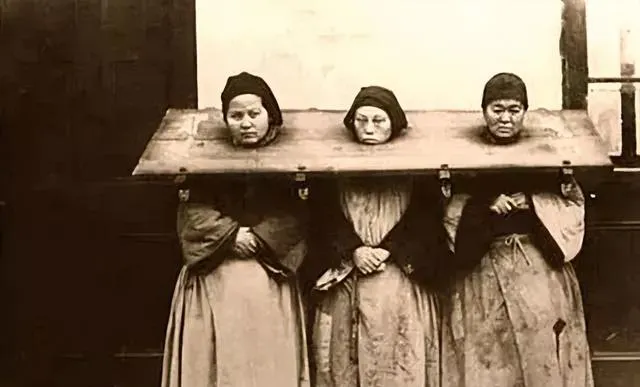 第二张更直白。三名女子被一整块长木枷连在一起,脑袋从木板里探出来,脸上没有什么表情,倒不是麻木,更像是知道挣也没用。你看她们的衣服,宽大、旧、下摆发皱,跟戏里那种精致囚服完全不是一回事。那时候的苦,不讲究镜头感。
