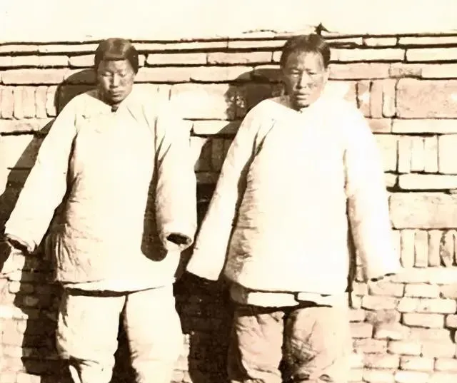 这张我第一眼注意到的是头发。不是盘得整整齐齐的发髻,而是剪短了,只在头顶留一点。她们靠墙站着,棉衣松垮,裤腿也肥,整个人像被衣服裹住。要是不说背景,你会不会以为这是更晚近的穷苦旧影?这就是老照片有意思的地方,它总会把你原先的想象悄悄改掉。