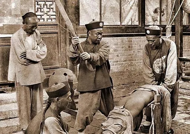 这一张不忍细看。院里站着几个人,执行杖刑的人已经抡起棍子,旁边的人神情各异,有冷眼看的,也有站着发愣的。院墙、门窗、石地都很普通,偏偏越普通,越显得这种事在当时并不罕见。真正让人发凉的,不是刑具,是它像日常一样发生。