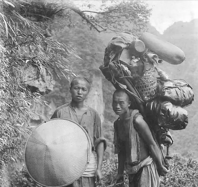 两个人站在山路边,一个背着高高一大架行李,几乎把整个人压弯;另一个拿着大斗笠,瘦得只剩筋骨。说实话,这一点我是真没想到,原来旧时山路运输能这么原始,靠的就是人的肩膀和腿。今天去景区讲轻松,放到那时,走一趟山路就是饭碗,也是苦力。