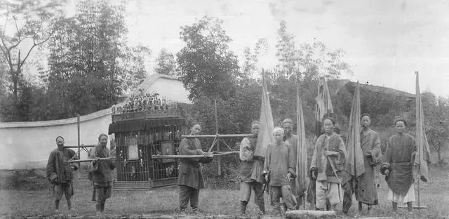 这张有点安静。几个人抬着轿子,旁边有人举旗,队伍不算气派,走得也不急。你看他们的衣服,全是日常布衣,没有什么鲜亮颜色。以前总觉得旧时婚礼一定热闹又讲排场,可这张照片里最明显的,其实是朴素。婚事是大事,但日子照样要一分一厘地算。