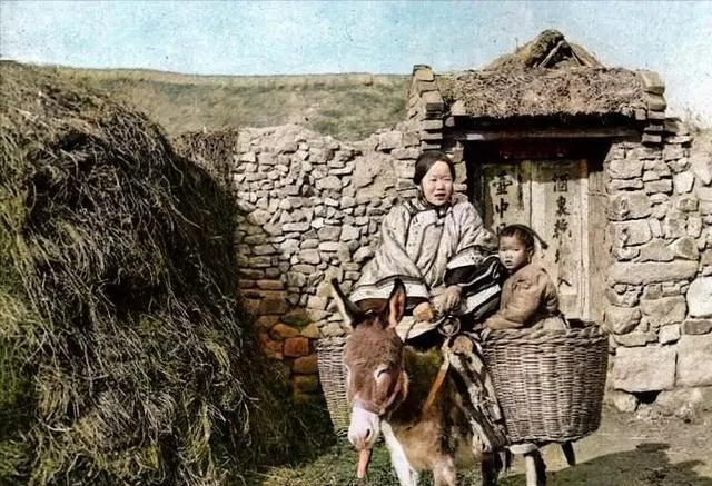 石头房、矮门、草顶,小毛驴背着两个大筐,一个孩子坐在筐里,女子穿着宽大的袄子,整个人也像被生活装在里头。很多人总说旧时女子服饰“古典”,可真放到这种场景里看,它首先是为了挡风、保暖、耐穿。美不美是后话,先得把日子扛过去。