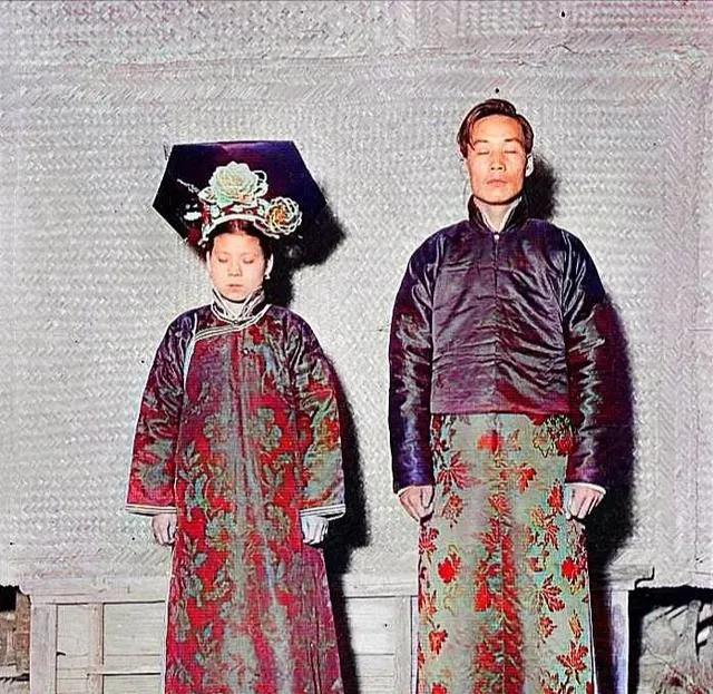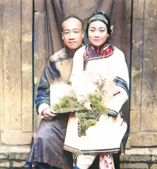 这张颜色淡淡的,却挺有味道。两个人并肩坐着,身子靠得近,手里还拿着一束草木。男的辫发后垂,女的衣领、袖口都有细边,明显比普通人家讲究些。可再讲究,姿势还是拘谨。那时候拍照不是随手一按,很多人一坐下,先紧张起来,连笑都要收着。