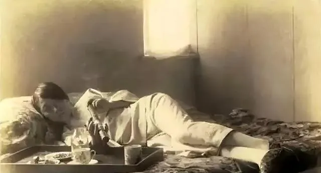 这一张和前面又不同。室内光线昏暗,女子斜躺在床上,旁边小几摆着器物,整个人松散得没有骨头。很多人看到这类照片,都会先注意姿态里的倦怠感。别管具体背景如何,这张图至少说明一件事:镜头留下的,不只是“穷”,还有那个时代某些隐秘而颓靡的一面。