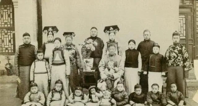 看到这一组人,就知道阶层差别有多大了。前排坐着长辈,后面站着妻妾子女,衣服颜色深,纹样密,头饰也高高立着。前面那些照片是布衣、棉袄、草屋,这一张忽然换成了规整庭院和华服人群,冲击特别大。同一个清末,有人苦熬日子,有人讲排场、讲门第。