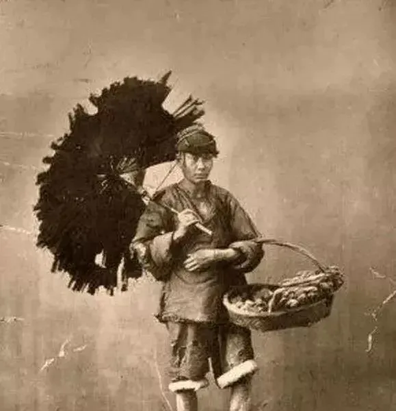 最后这张,我反倒看了很久。小贩卷着裤腿,光脚站着,一肩扛着伞一样撑开的货架,一手提着篮子。衣服短,身形瘦,脸上却还有股要把生意做下去的劲头。清末的真实生活,大概就是这样:没有滤镜,没有体面包装,但人总得往前走。