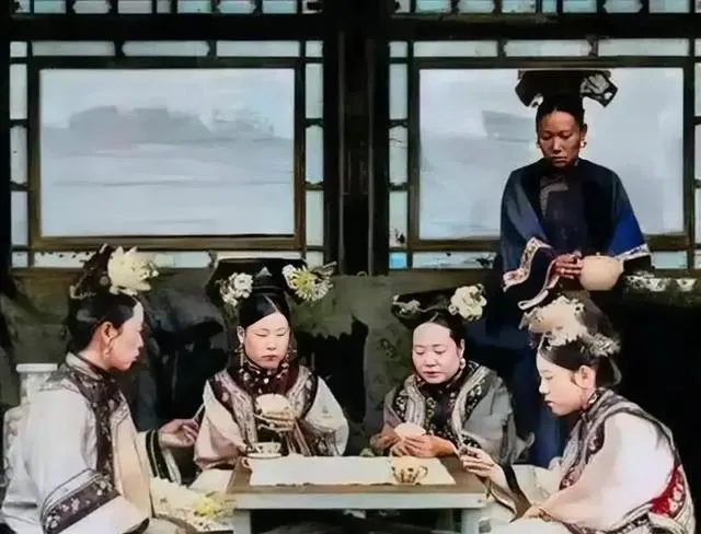 第一张最抓眼的,其实不是牌桌,而是这几位贵妇的神态。她们坐得很稳,衣服一层一层压下来,花饰戴得讲究,连手里拿牌的姿势都透着慢条斯理。后面站着的佣人提着壶,像是随时等着添水。以前总觉得晚清女子生活单一,可这张图一摆出来,那种富贵人家的闲日子就出来了。