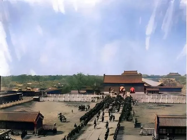 这张大场面很有冲击力。长长的队伍,从空旷的宫门前一直排过去,规矩、秩序、排场,全在里头。最有意思的是,照片里的建筑并不花哨,反而显得冷清,越是这样,越把队伍的仪仗衬出来。你要是不说这是清末,光看这阵势,还真会觉得皇权离老百姓特别远。