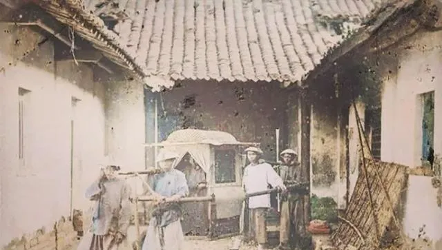再看这一张,官轿从院门前过去,旁边跟着人,步子都不敢乱。轿子不算大,可那种“闲人回避”的气场已经很明显了。以前常听老人说,旧时看一个人身份高不高,不只看穿什么,还看出门有没有人抬、身边跟着几个人,照片把这话说实了。