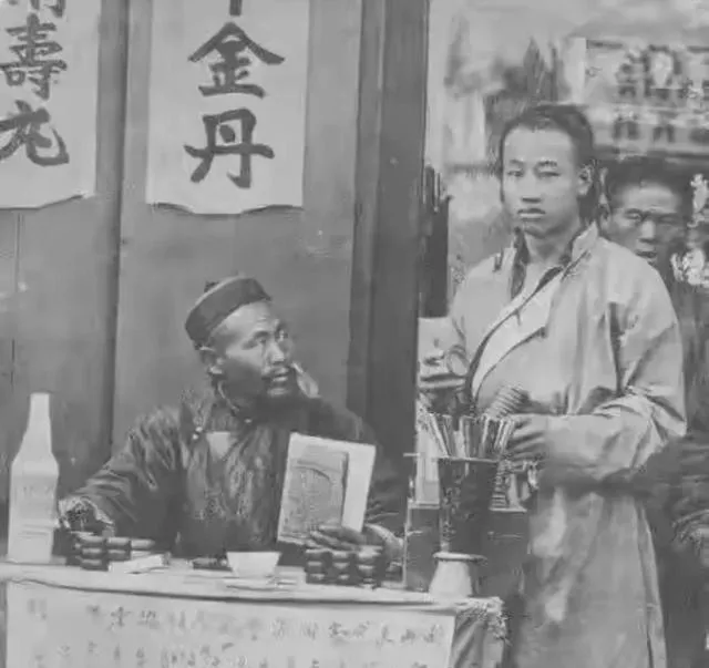 算卦先生坐在摊前,桌上东西不多,旁边年轻人站着,像是半信半疑。这样的街头小摊,以前城里乡下都常见。它吸引人的地方,不只是“算命”两个字,而是那种旧社会街头的杂糅感:有人讨生活,有人找答案,也有人纯粹凑个热闹。