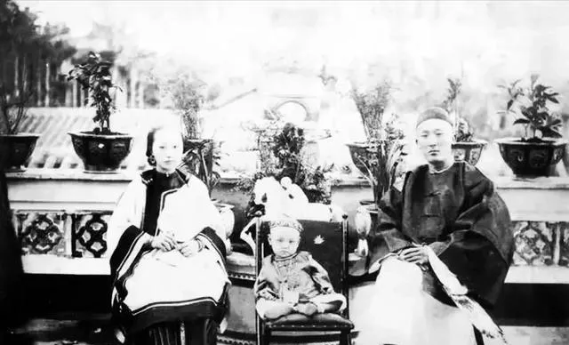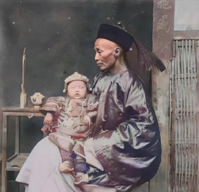 这张很有生活气。一个官员模样的人抱着孩子坐着,旁边桌上放着细长的烟具。孩子肉乎乎的,靠在大人怀里,竟有点今天“爷爷带娃”的感觉。要是不看服饰,谁能想到这是清末?时代再远,抱孩子的姿势、看孩子的神情,其实都差不多。