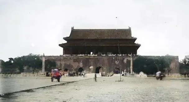 天安门这张,最扎眼的是空旷。城楼还在,可墙体已经显出破败,前面的地面也没有后来那种整肃开阔的感觉。几辆车散在前面,越显得苍凉。以前我们印象里的天安门,总是庄严完整的,可这一张告诉你,历史里也有狼狈的时候。