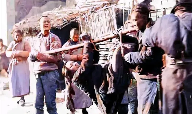 这张让人看着发紧。衣服破,身上挂着铁镣,整个人像是被拖在日子后头。旁边围观的人表情各异,但没有谁能轻松起来。旧时代的苦,不一定都写在大事件里,很多时候,就写在一个人的衣角、脚步和眼神里。