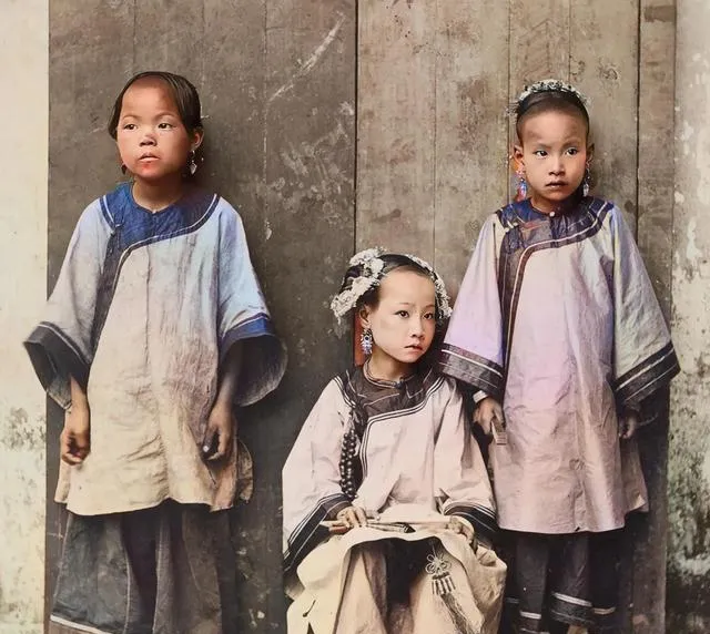 第一张最抓人的,就是这三个小女孩。中间坐着的,明显和两边不一样。她坐在正中,头饰更精细,衣料也更讲究,眼神里有种被照顾惯了的安稳。再往下看,一双小脚很显眼,那个年代身份高低,有时候不用说,光看鞋子和站位就差不多明白了。