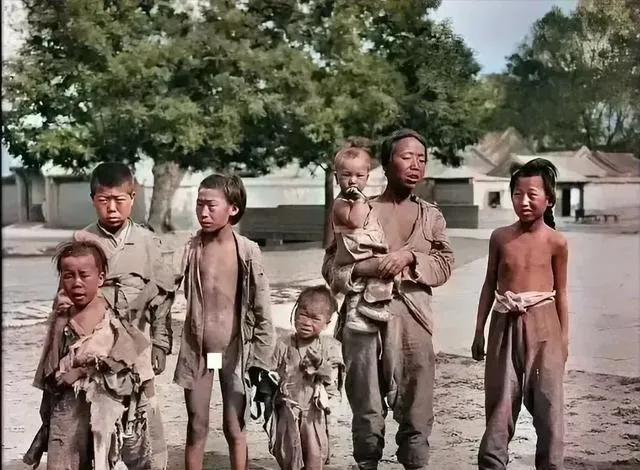 这张照片看着真不轻松。几个孩子和一个大人站在空地上,衣服破得不像样,有的干脆半敞着,布片一条条挂着。最难受的不是“破”,而是那种长期吃不饱、穿不暖的样子,瘦,干,脸上没有孩子该有的活气。