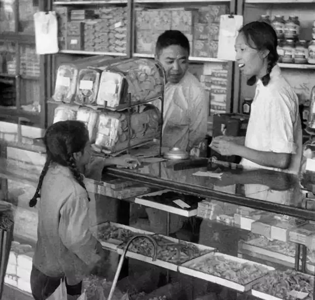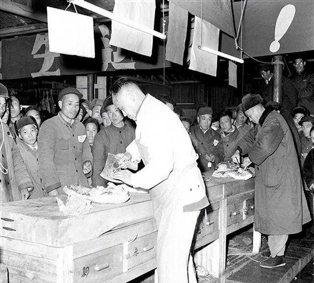第一张就很有冲击力。卖肉师傅站在案板后面,旁边围着一圈人,眼神都盯着肉。上面挂着纸片,气氛很紧,像是谁都不敢错过轮到自己的那一刻。那时候买肉不是“想买就买”,而是有票还得有钱,有钱还得赶上货。很多人都记得,割三角钱的肉,还得盼着售货员给你带点肥的,回家好炼油。