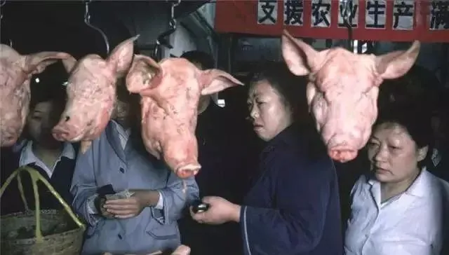这张照片,说实话我第一眼都愣了一下。几只猪头整整齐齐挂着,旁边的人神情却很平静,像是在完成一件再普通不过的日常采购。今天看会觉得稀奇,可在当年,这就是市场里最真实的画面。能买到什么,买到多少,很多时候都不是嘴上说了算。越是普通的吃食,越能看出日子的分量。