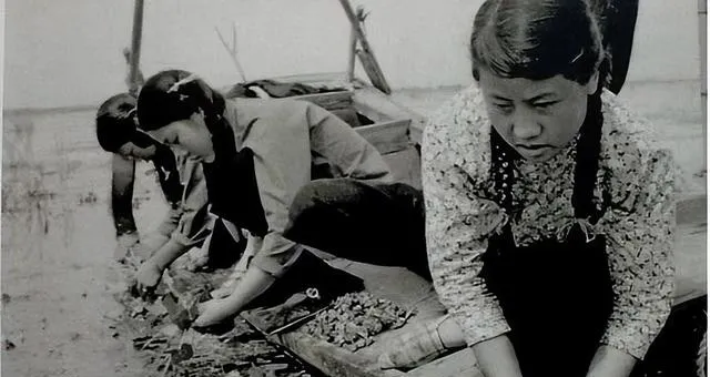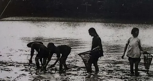 几个孩子站在浅水边,弯腰摸鱼捞虾,手里提着篮子。这样的画面很野,也很真。那时候乡下孩子的快乐,有时候就是一条小河、一片泥滩,摸点小鱼小虾,带回家里还能添个菜。今天的孩子娱乐多了,可这种和自然贴得很近的日常,反倒少见了。
