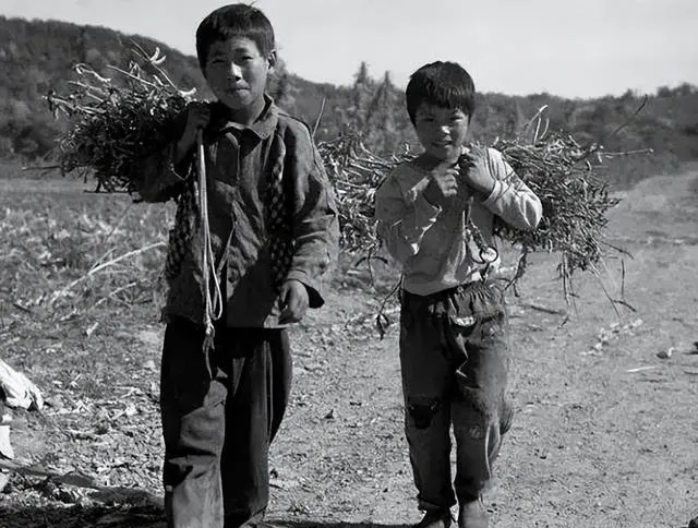 这张最容易让人心里一紧。两个孩子,一前一后,背着柴火往前走,衣服宽大,裤子打着补丁,脸上却没有抱怨。以前常说穷人家的孩子早当家,看到这种照片才知道,那不是一句空话。童年当然也有玩的时候,但很多孩子很早就开始替家里分担了。