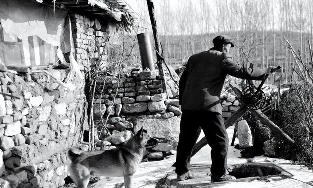 石头垒的墙,院里一口井,一位老人正弯着腰压水,旁边还跟着一条狗。这个细节太熟了。过去不少人家的水,不是拧开水龙头就来,而是得一下一下压出来。冬天手冻得发红,夏天井边一圈水渍。日子是慢一点,可每一瓢水都带着手上的力气。