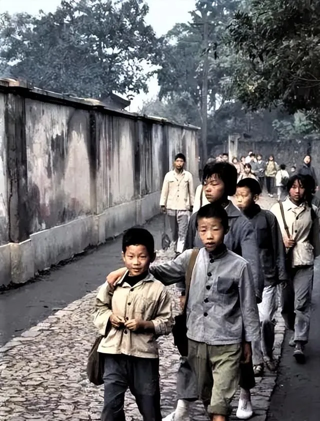 这一张太有代入感。孩子们背着书包,沿着石板路往前走,衣服颜色都偏灰蓝,鞋子也简单。可你仔细看,他们的神情并不沉闷,反而有股结伴上学的轻松劲儿。那个年代读书条件不算好,路也不好走,但很多人对上学这件事,是真的当回事。