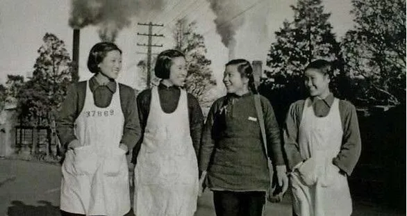 最后这张,我很喜欢。几个年轻女工并排往前走,围裙还系在身上,边走边说话。背景里有烟囱、有电线杆,一看就是那个年代典型的厂区生活。她们脸上的神情,不是摆拍出来的,是干完活后的放松。六七十年代的日子确实不轻松,可很多人的精神头,就在这种普通画面里。
