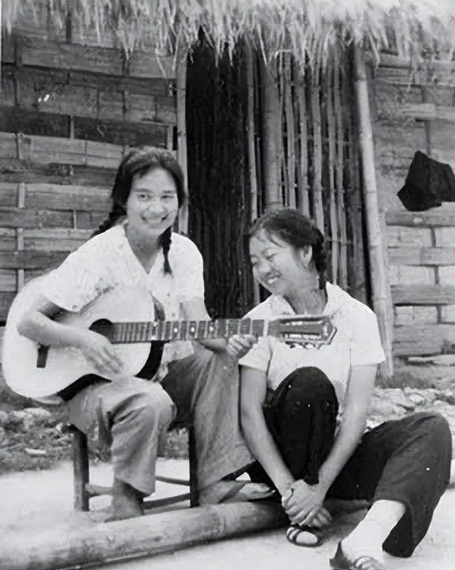 这一张一下柔和了。院门口、竹篱笆、低凳子,一位姑娘抱着吉他,另一位坐在旁边笑着听。衣服还是劳动后的普通衣服,鞋也不讲究,可就是有一种很松弛的好看。艰苦不等于没有文艺,劳作之外,人总要有点歌声、有点玩笑、有点喘口气的时候。