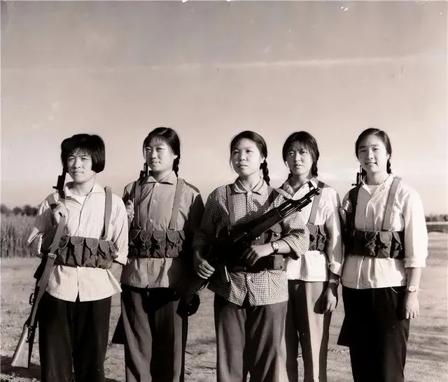 这张挺出乎意料。一个姑娘趴着持枪,另一个在旁边指着前方。辫子、衬衣、手表,这些都还带着年轻女孩的气息,可一到训练场上,神情马上变得很认真。原来照片里的她们,不只是会下地、会做饭、会劳动,也有集体训练、民兵活动这样的一面。这种反差,今天看特别鲜明。