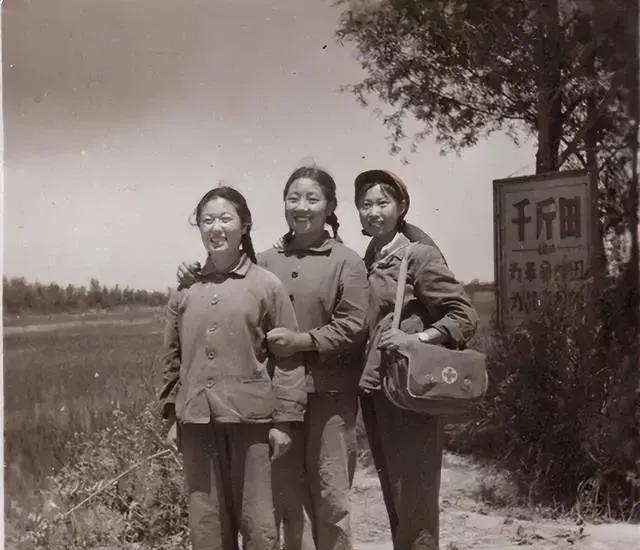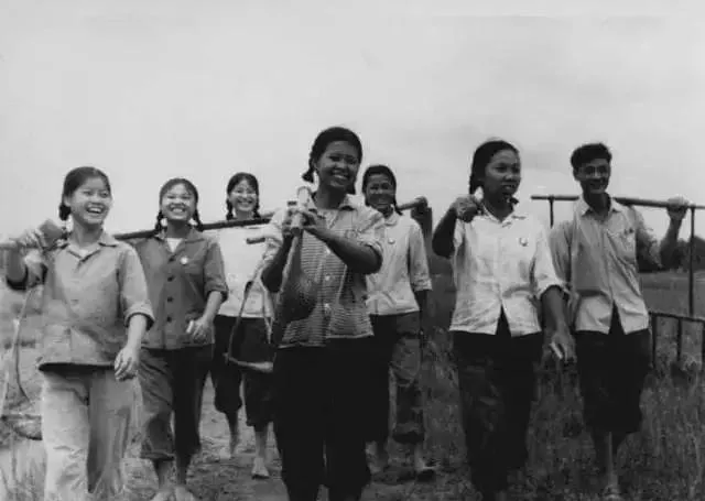 三位姑娘站在水田里,裤腿卷起来,腿泡在泥水中,手里还拿着干活的工具。远处也有人,田面一片亮光。这样的场景,老一辈人看着应该很熟。水凉,泥黏,弯腰久了腰发酸,可照片里几个人还是笑着。那个年代的很多记忆,就是这么被泥水、太阳、汗味一点点攒下来的。