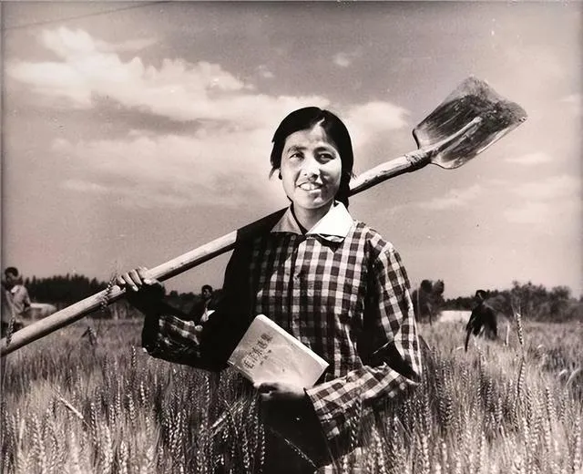 后面的这些照片连起来看,才更像完整的女知青生活。她们会在露天场地演出,穿着差不多的上衣,动作整齐,台下围着人群;也会背着枪列队,站得笔直;会在路边挎着包,笑着留影;会在地头蹲下来歇一会儿,衣服上还带着劳动痕迹;会一手扛着铁锹,一手拿着书,从麦田里走出来。这个细节特别有意思,劳动和学习,在她们身上常常是挨在一起的。