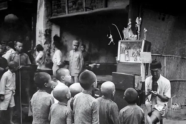 第一张就很抓人。一群剃着光头的小孩,围着一个小小的戏台看得入神,前面坐着操弄木偶的人,后面站着看热闹的大人。最有意思的是这些孩子的神情,脖子伸着,眼睛盯着,安安静静挤成一团。那个年代没有手机,没有动画片,可一个街头戏摊,就足够把半条巷子的热闹都聚过来。
