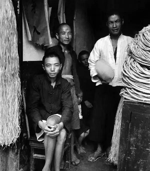 再看这张屋门口的照片,第一眼注意到的不是穷,而是人很松弛。有人坐着,有人站着,有小孩躲在后面看镜头,旁边堆着绳索、草料一类的东西,说明这就是普通人家过日子的地方。衣服当然旧,鞋子也简,可神情并不缩着。那种日子苦不苦?肯定辛苦。但照片里还有一种很实在的劲头。