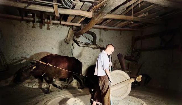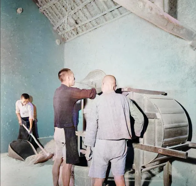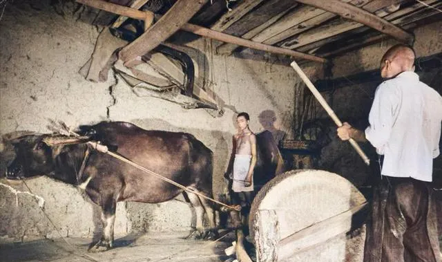 这几张放在一起看,特别能看出当年的农村生活节奏。碾米、扬谷、牛拉碾盘,全是力气活。房梁粗,地面实,灰尘和谷壳混在一起,干活的人穿得都很简单。以前总觉得“男耕女织”只是书上的词,真看到这些画面,才知道那四个字后面,全是一天一天磨出来的日子。