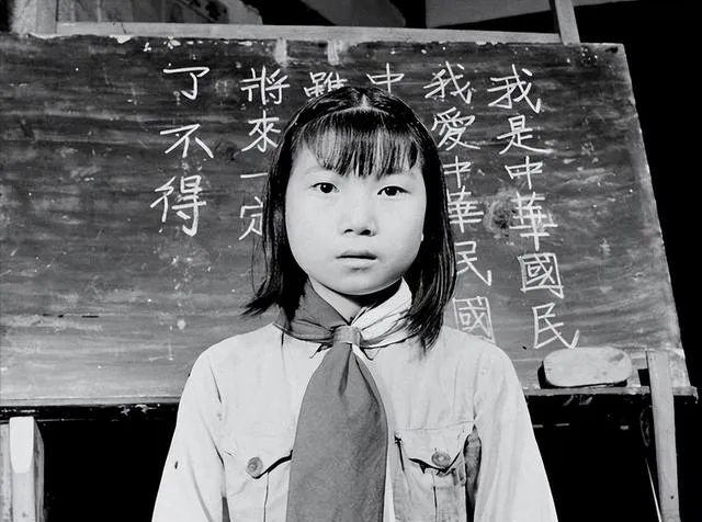 这张小女孩照片很有冲击力。她站在黑板前,头发剪得整齐,脖子上系着红领巾一类的领巾,眼神很直。黑板上的字也很醒目。你会发现,哪怕在那样的年代,读书、识字、进学堂,已经是很多家庭很看重的事了。一个孩子站在镜头前的样子,往往最能看出一个地方的精神头。